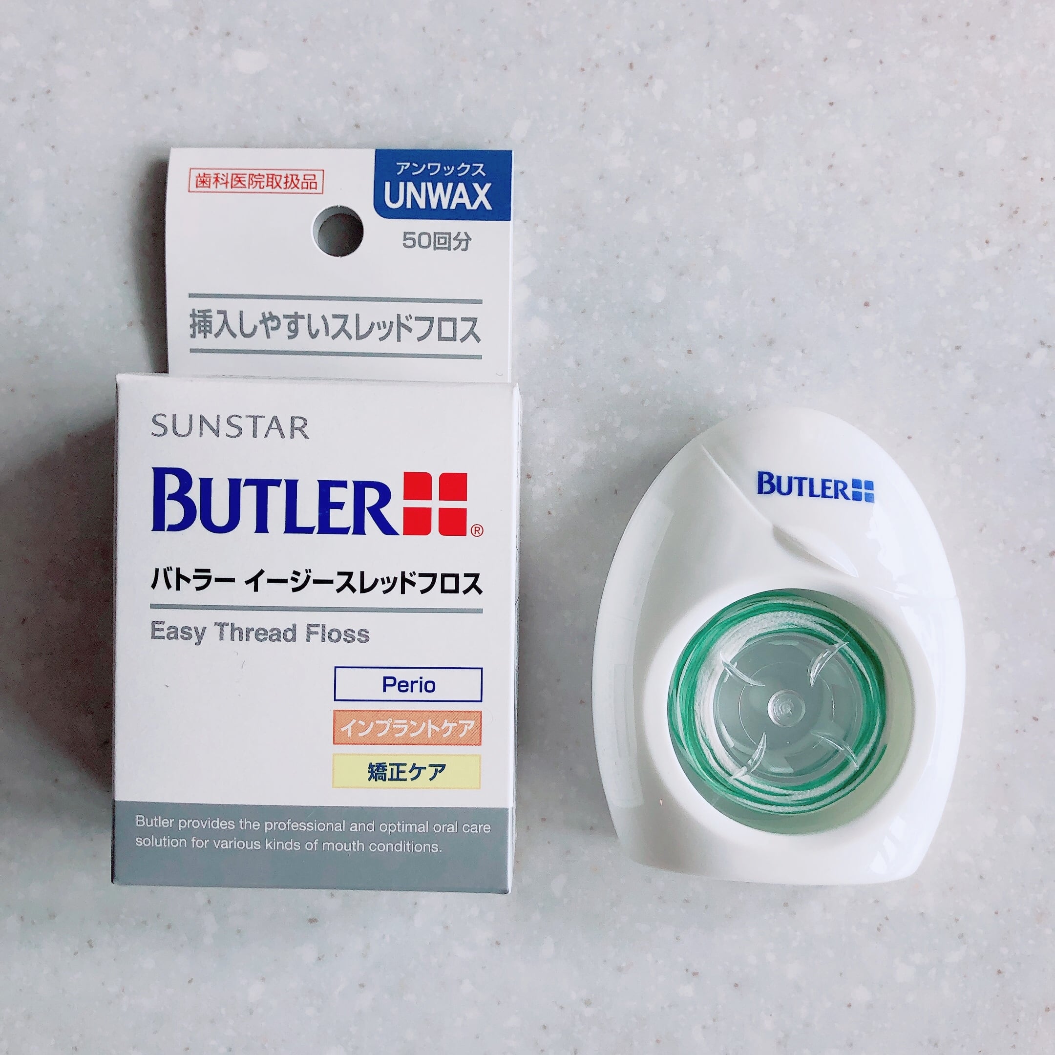 インプラント、矯正装置や補綴装置の隙間に挿入しやすいスレッド(糸通し付き) 1本に2つの機能 (1)緑色のスレッド(糸通し)部が付いたフロス (2)特殊ナイロンフロス 容量/50回分 アンワックスタイプ うれしい巻き戻し機能付き!